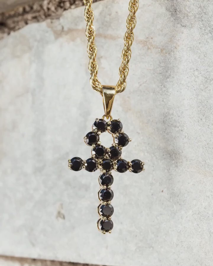 Style: Micro Onyx Ankh Cross Necklace Pendant & Rope Chain